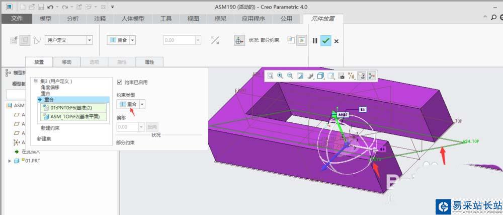 8、新建一個約束,約束類型設為“重合”,單擊”ASM_TOP“基準面和”PNT0“基準點。