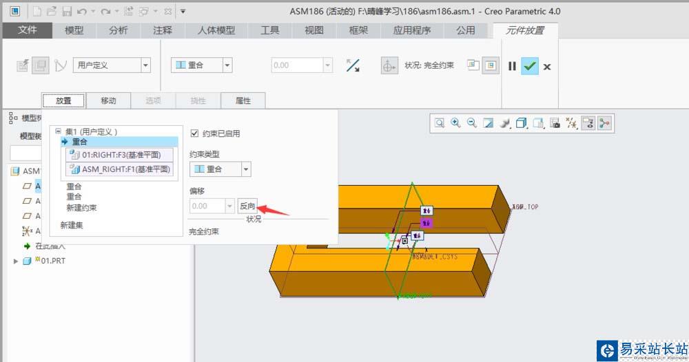 重合時如果要求反向,可以通過”元件放置“操作板中”放置“選項里的”反向“切換方向