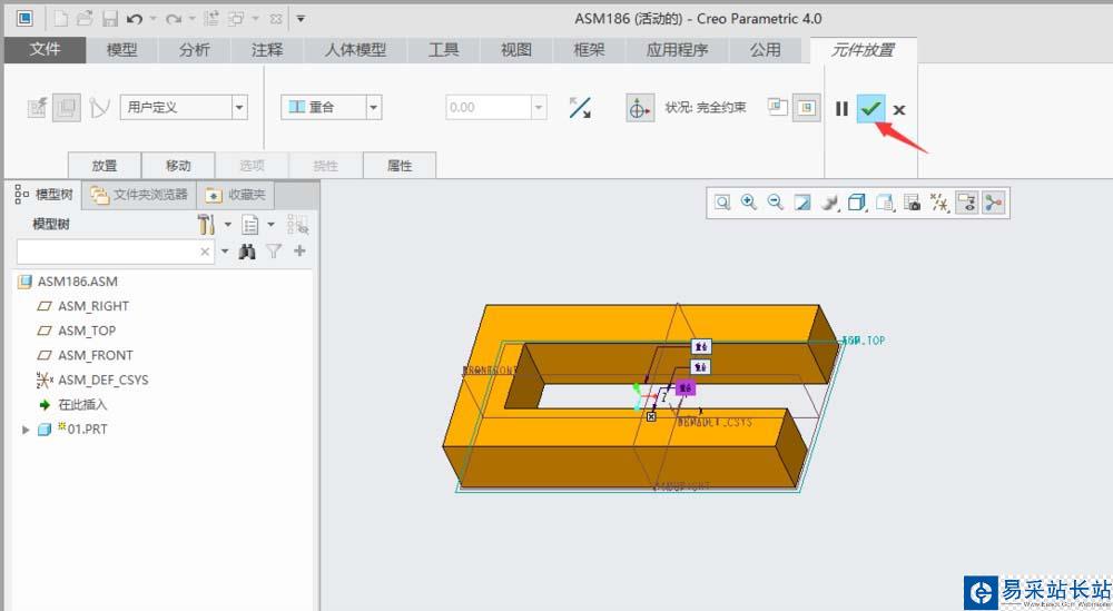 9、通過以上3組約束后,零件”01.PRT“完成被約束,單擊“元件放置”操作板中的“確定”按鈕,完成零件裝配。