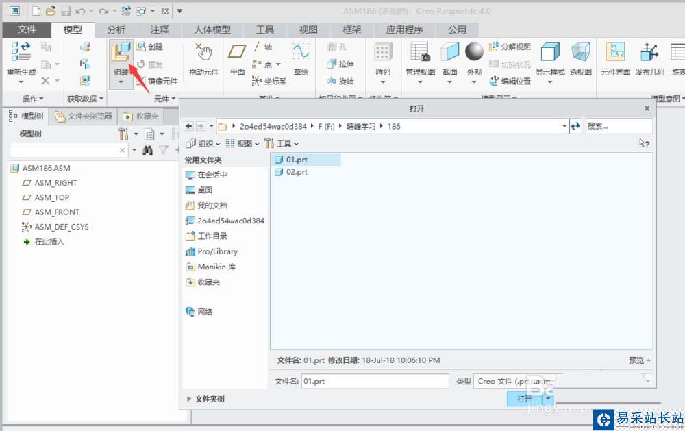 2、單擊“模型”功能選項卡“件區”域中的“組裝”。彈出“打開”對話框。