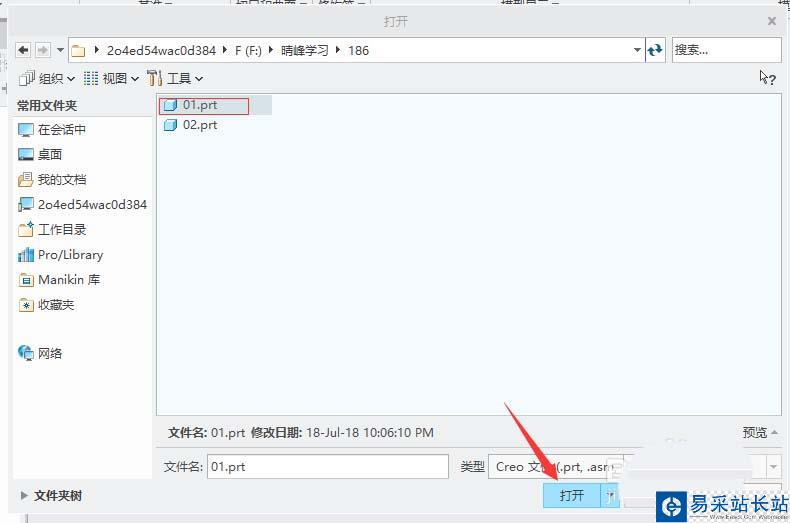 3、在“打開”對話框中找到選中要組裝的零件名稱(比如下圖中的"01.prt"),單擊“打開”。