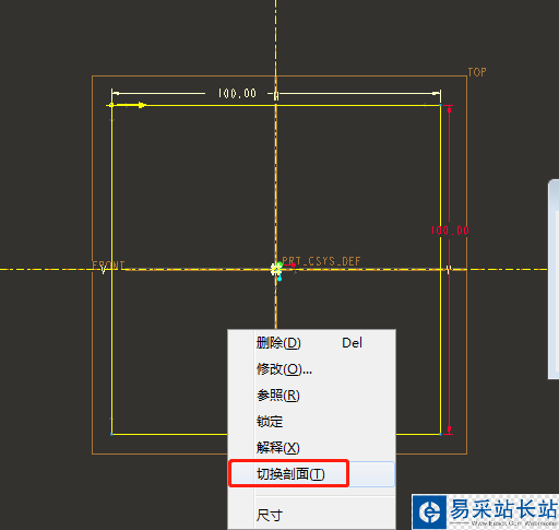 4、在草繪平面上繪制第一個截面,并標注好尺寸。再在空白處點擊鼠標右鍵,選擇“切換剖面”,繪制第二個截面,也輸入尺寸值。