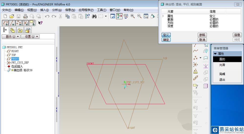 3、選擇好草繪平面,再在屬性中點出“直的/完成”,然后開始定義截面