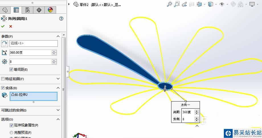 6、使用實(shí)體圓周陣列命令,得到其余的花瓣模型。