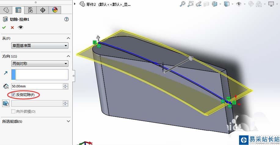 4、使用拉伸切除命令,注意這里選擇了反側(cè)切除,也是就僅僅保留草圖輪廓內(nèi)的實(shí)體。