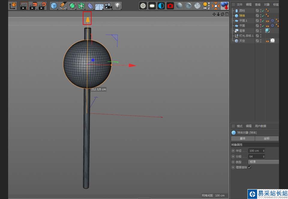 按住向上的箭頭拖動球體到如下圖所示位置。