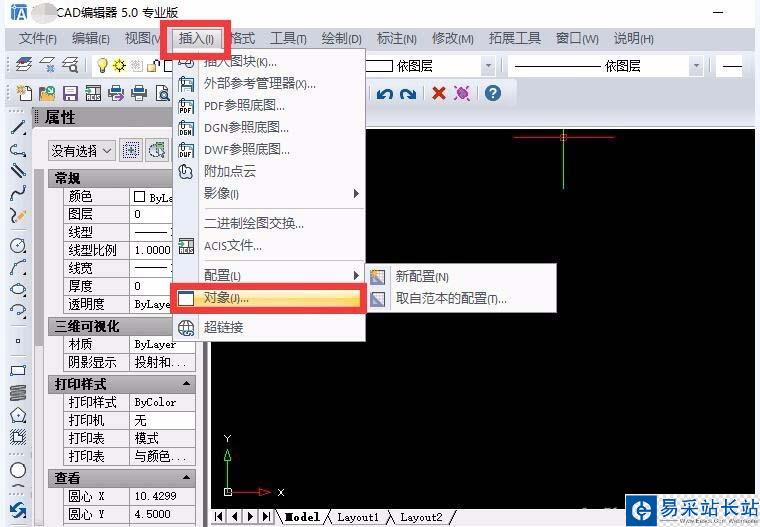 2、隨后在頂部菜單欄中點擊【插入】——【對象】按鈕,并激活該命令選項。(如圖)