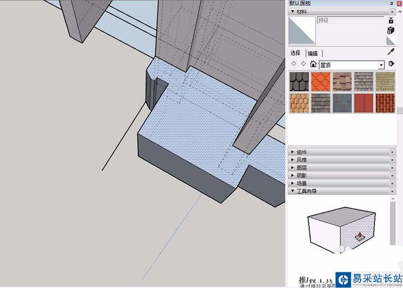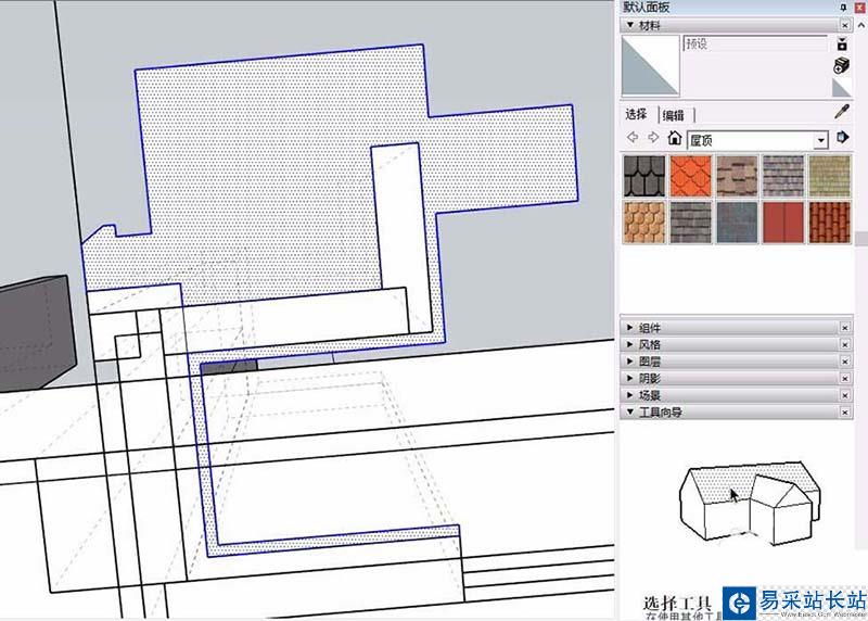 3、如果是比較特殊的外飾面,我們最好使用鉛筆工具進(jìn)行勾勒,su只有閉合線條才會形成面,我們需要注意閉合線條。