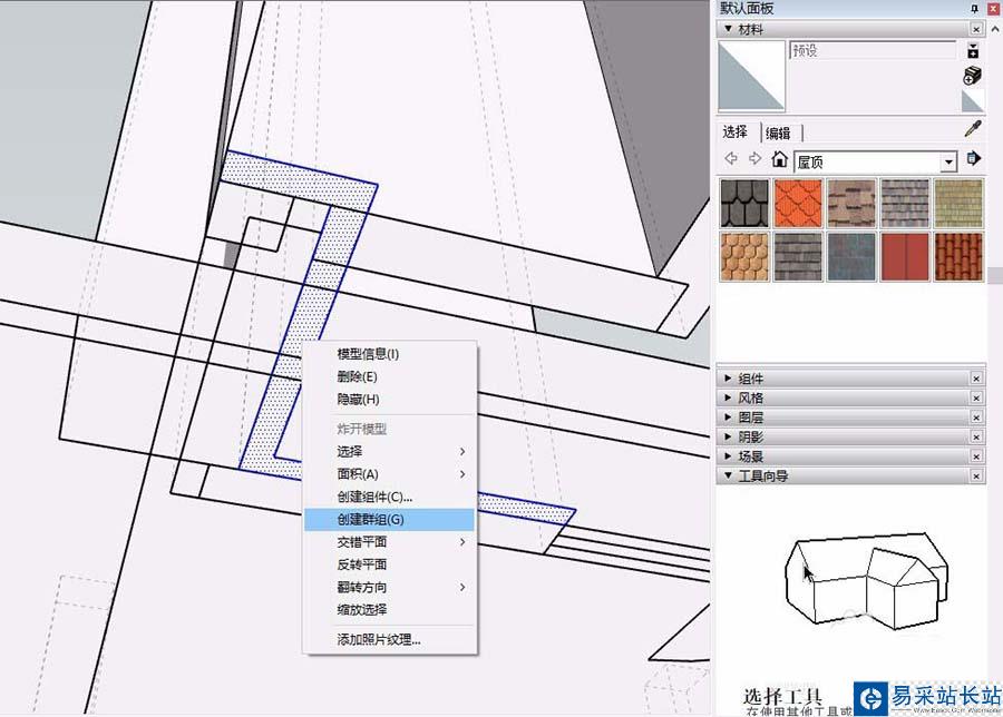 7、在模型中,對墻體、保溫層等進行分別編組,即可很好的進行后期修改操作,完成墻體和保溫后,我們就可以對模型進行外飾面的處理。
