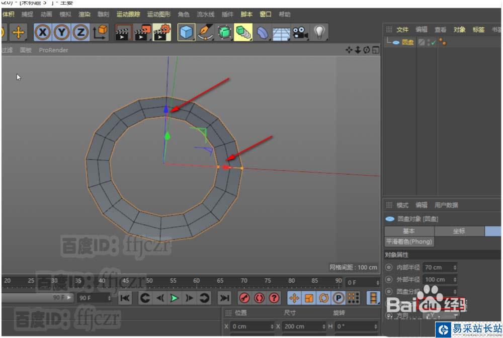 1、創建一個圓盤,內部半徑為70,外部半徑為100,圓盤分段為2,旋轉分段16;方向為Y。