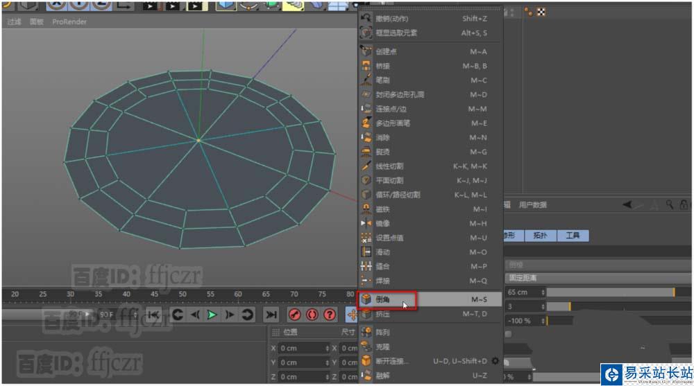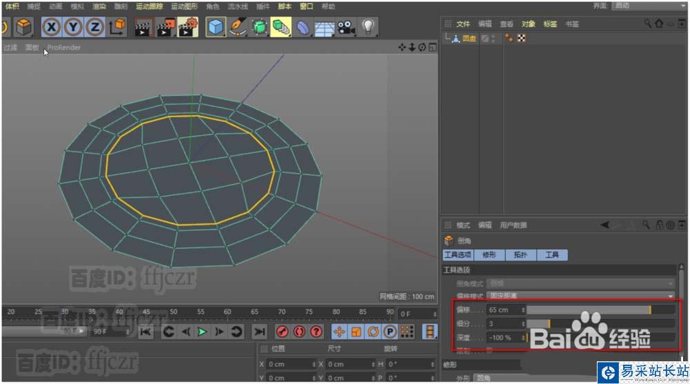 4、在點模式中,選中圓心點進行倒角;倒角的細分數與圓盤的分段數要契合,在這里倒角的參數是:偏移65,細分為3,深度為-100。