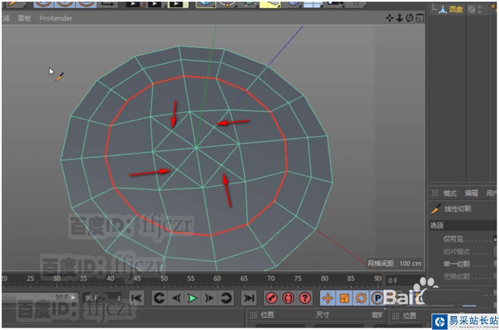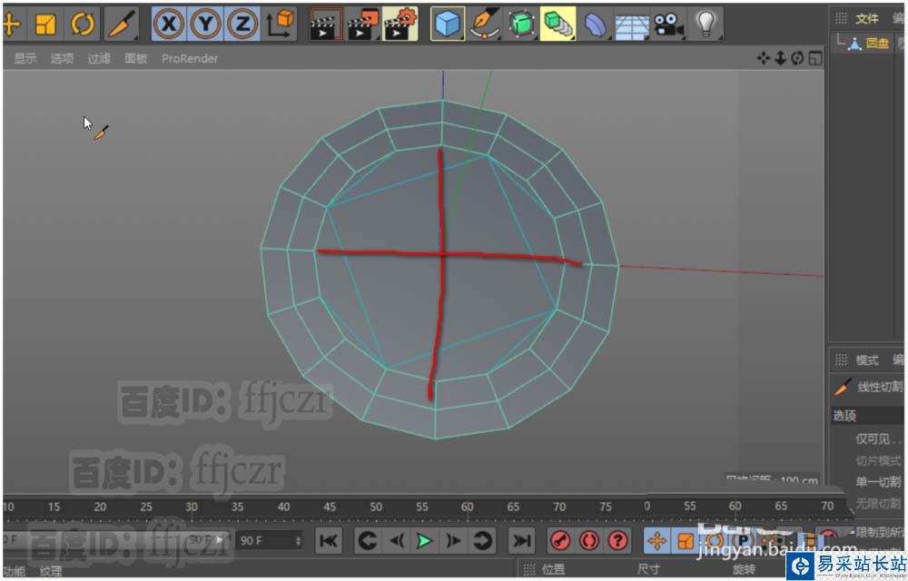 3、用切刀工具根據坐標軸與圓盤的結構添加二條形成圓心的結構線;圓心的點將是本次調整結構線的關鍵。