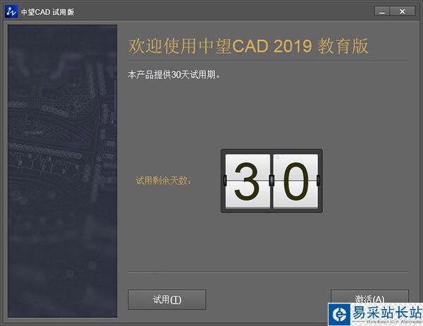 6、打開桌面上生成的中望cad2019教育版快捷鍵,彈出30天試用期;