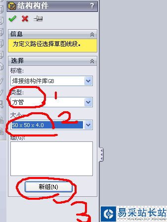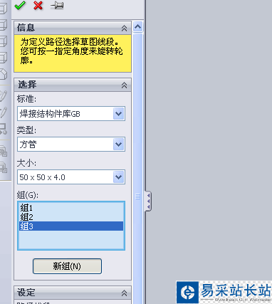 4、點擊新建組,然后選擇3D草圖中的線段路徑即可直接生成方管。