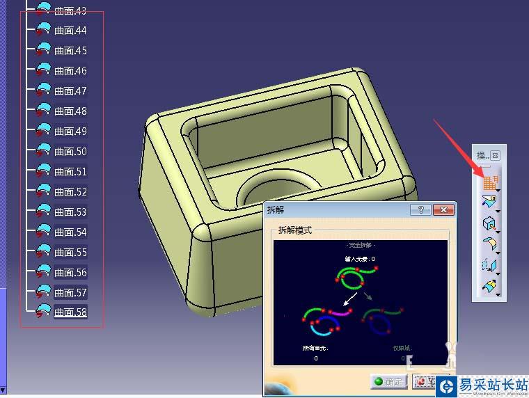 4、分解曲面。使用圖示分解命令將整體的曲面模型分解成一個個面體,此時可從樹狀圖中看到多了很多單獨的面,并且可以對其中任意一個面單獨編輯。從形狀樹中隱藏掉實體和整體曲面部分。