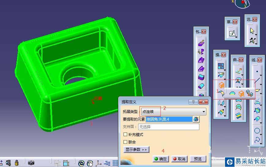 3、從實體中提取面。我們先使用“提取”命令,按圖示1、2、3、4步驟操作后,得到一個該零件的曲面模型(此時可以在操作樹下面看到有一個提取操作),但此時該模型還是一個整體的面,需要打散后才能編輯曲面。