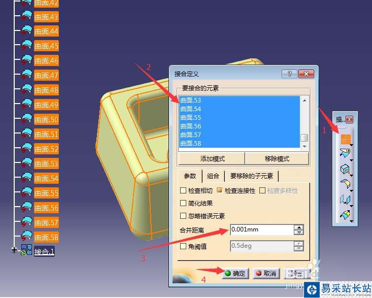 5、接合曲面。對分散的片體編輯完后,需要將這些片體接合成一個整體才能生成實體模型。按圖示步驟操作即可。如果模型很復(fù)雜難以接合成整體,可將步驟3中的合并距離容差設(shè)置為0.1。