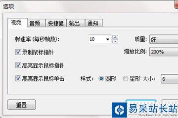 3、點擊選項圖標設置相應的錄屏參數,可設置參數包括:視頻(視頻幀速率、樣式等)、音頻(音頻質量、單擊音量等)、快捷鍵(默認快捷鍵:放大/縮小為F5,暫停/繼續為Ctrl+F10)、輸出(文件名稱模板、是否播放視頻等)、通知。