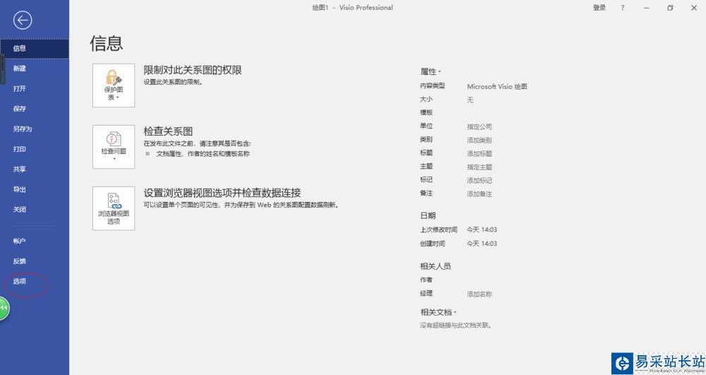 5、喚出"文件"菜單選項,如圖所示。點擊左側"選項"項,用于打開"Visio 選項"對話框。