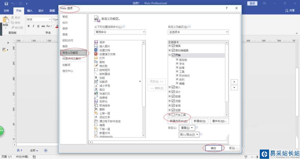 6、如圖所示,彈出"Visio 選項"對話框。選擇左側"自定義功能區"項,勾選右側"自定義功能區→主選項卡→開發工具"復選框。