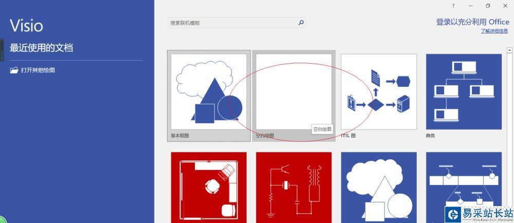 2、如圖所示,喚出"Visio 2016"程序窗口。拖動右側垂直滾動條,點擊"空白繪圖"項用于新建繪圖。
