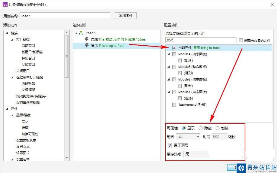 2.顯示”動態面板:組件1“;置于頂層