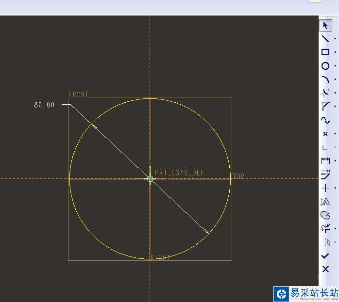 3、如下圖所示,進入到草繪環境,首先點擊右邊工具箱中的“圓”圖標,然后在草繪區域以坐標原點為圓心畫一個圓,然后點擊右邊工具箱中的“標注”圖標,然后標注圓直徑80,然后點擊右邊工具箱最下方的√,完成并退出草繪。