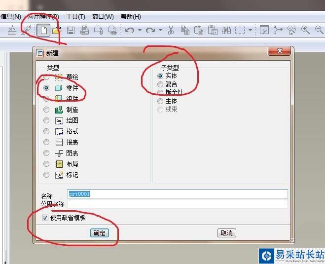 1、如下圖所示,打開Pro/e5.0軟件,點擊標題欄中的“新建”圖標,設置“新建”對話框:類型為零件,子類型為實體,勾選“使用缺省模板”,點擊“確定”。