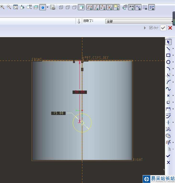 6、如下圖所示,進入到草繪環境,首先點擊右邊工具箱中的“圓”圖標,在草繪區域中心線上畫一個圓,然后點擊右邊工具箱中的“標注”圖標,按照下圖尺寸進行標注,最后點擊右邊工具箱中的√,完成并退出草繪。