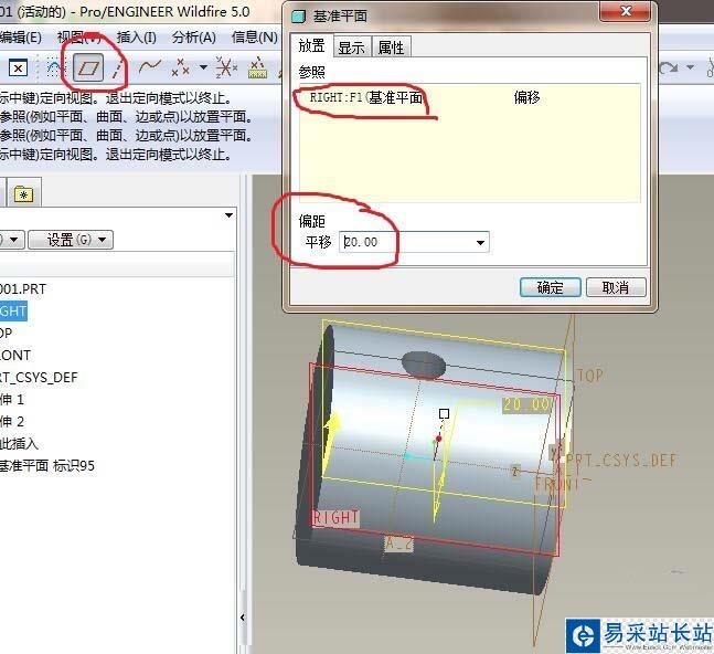 8、如下圖所示,創建基準面。具體:點擊工具欄中的“平面”圖標,參照一欄點擊RIGHT面,偏距平移設置為20,點擊“確定”,完成基準面DTM1的創建。