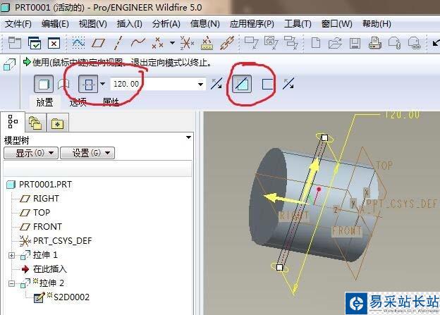 5、如下圖所示,執行【拉伸——放置——定義——RIGHT面——草繪】。