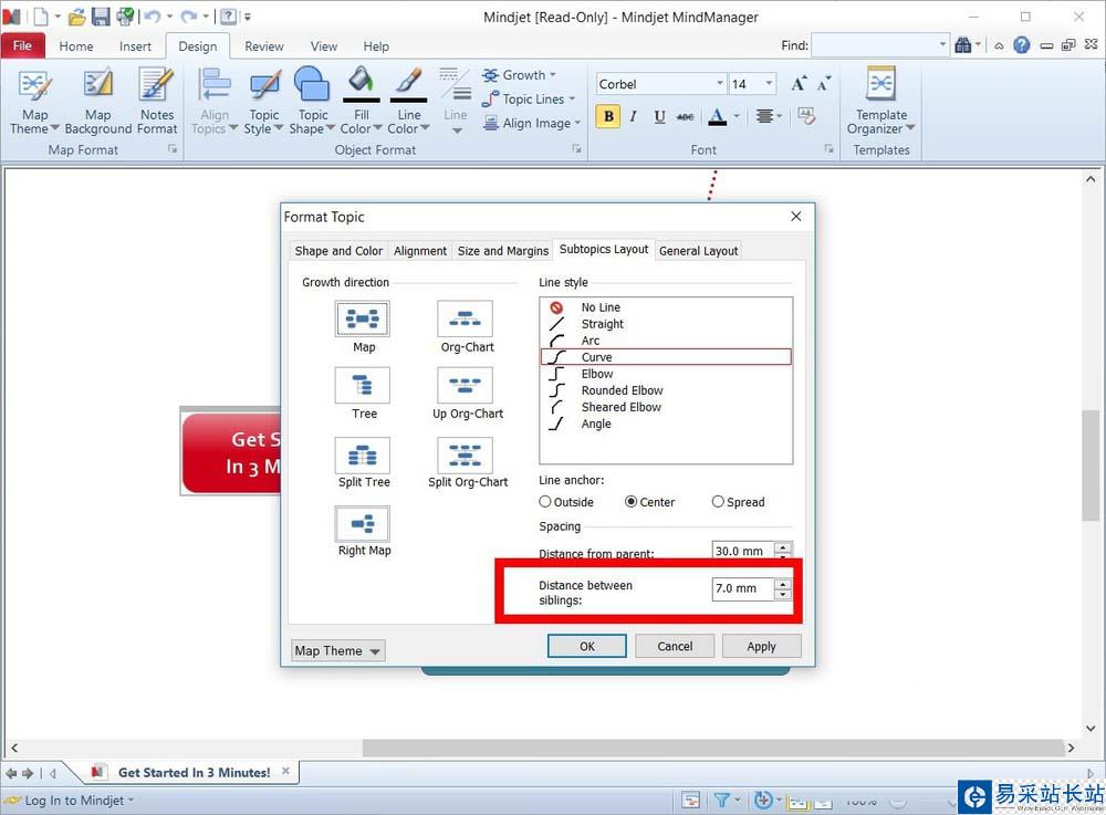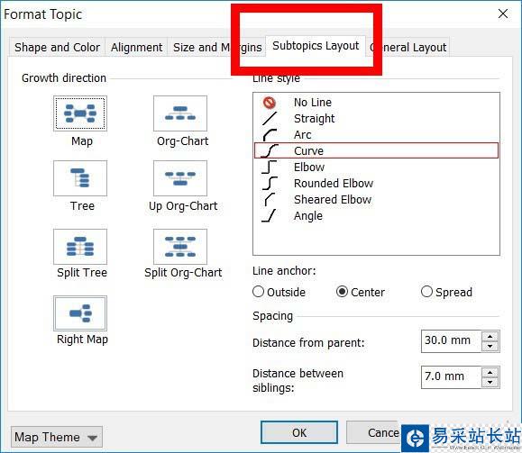 7、在彈出的【Format Topic】對話框中,選擇【Subtopics Layout】,調(diào)整其中的【Distance between siblings】參數(shù)即可