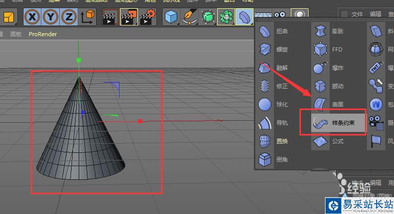 2、將樣條約束拖動到圓錐的下方處理,如圖所示