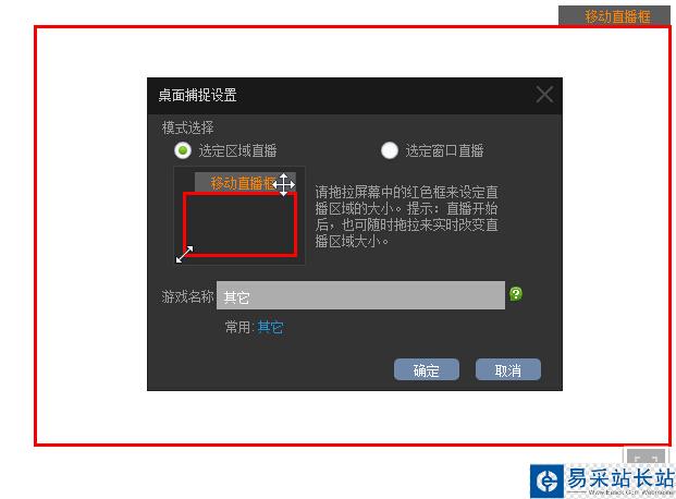 2、在彈出的“桌面捕捉設置”里填上游戲名稱,點擊確定后會加載直播工具條。