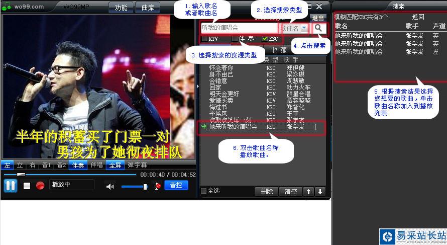 1、打開(kāi)wo99伴奏盒,10萬(wàn)首優(yōu)質(zhì)帶歌詞立體聲原版伴奏,9萬(wàn)首高品質(zhì)KSC伴奏以及歌詞,大家可以按照?qǐng)D上標(biāo)示步驟操作