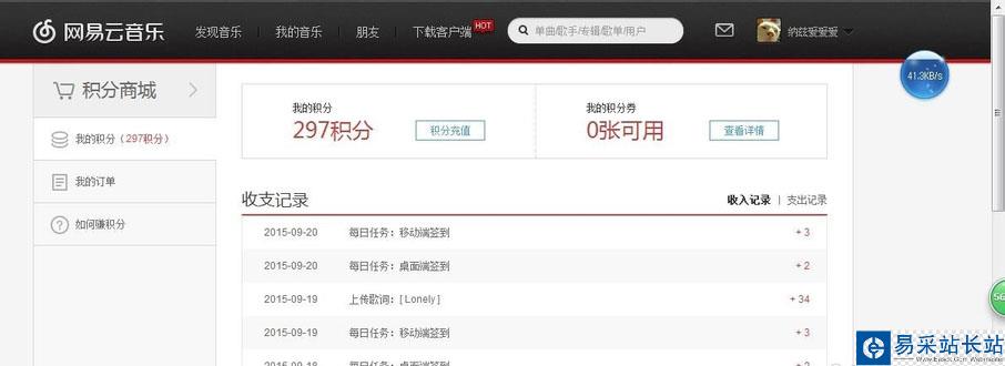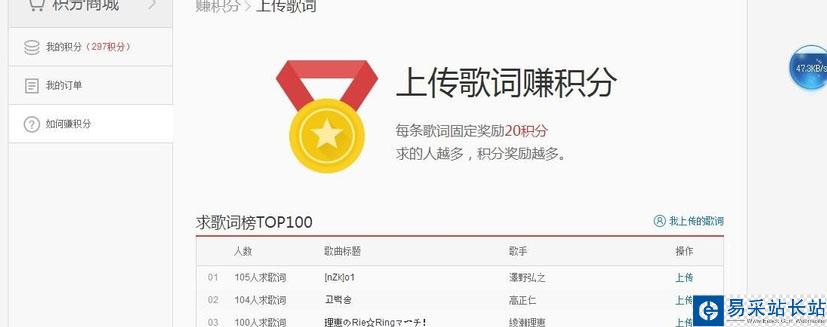 然后就會看到頁面的右下方有很多賺積分的方法,比如簽到,上傳歌詞等等,點擊上傳歌詞選項