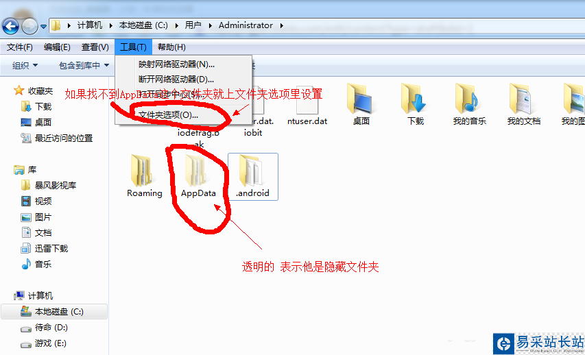 找到困擾你很長時間的文件夾c:/用戶/Administrator/AppData/Roaming/funshion 如果沒有設置隱藏文件夾可見的話是找不到的 具體設置方法如下