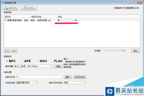 此時需要轉(zhuǎn)換的歌曲便顯示在格式轉(zhuǎn)換工具窗口的轉(zhuǎn)換列表中。點擊:轉(zhuǎn)換格式【MP3】,確定目標文件夾,【任務優(yōu)先級】我們可以選擇:加速處理或資源優(yōu)先,【目標文件存在時】可以選擇:重命名、詢問或覆蓋,最后點擊:轉(zhuǎn)換文件;
