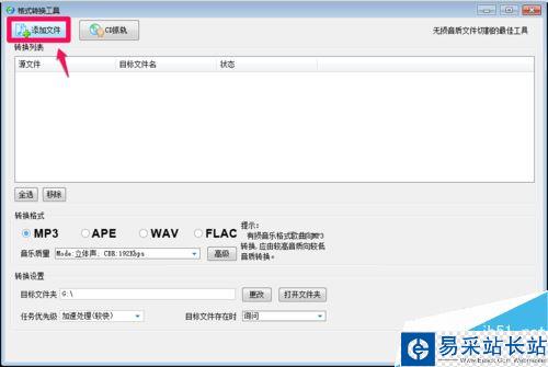 在打開的格式轉(zhuǎn)換工具窗口,我們點擊:添加文件;