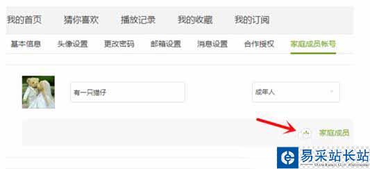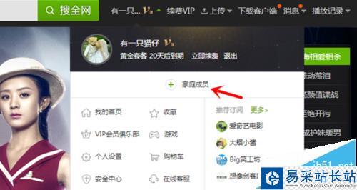 2、進入愛奇藝的官網后,在右上角找到登錄的選項,輸入用戶名和密碼進行登錄。之后把鼠標放在頭像上,選擇【家庭成員】。