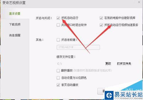 2、在打開的愛奇藝視頻設(shè)置窗口中,取消掉“開機(jī)自動(dòng)運(yùn)行”與“開機(jī)自動(dòng)運(yùn)行視頻加速服務(wù)”前的兩個(gè)復(fù)選框