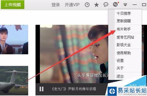 7、接下來我們?cè)俅吸c(diǎn)擊客戶端右上角的選項(xiàng)按鈕,在彈出菜單中選擇“傳片助手”菜單項(xiàng)