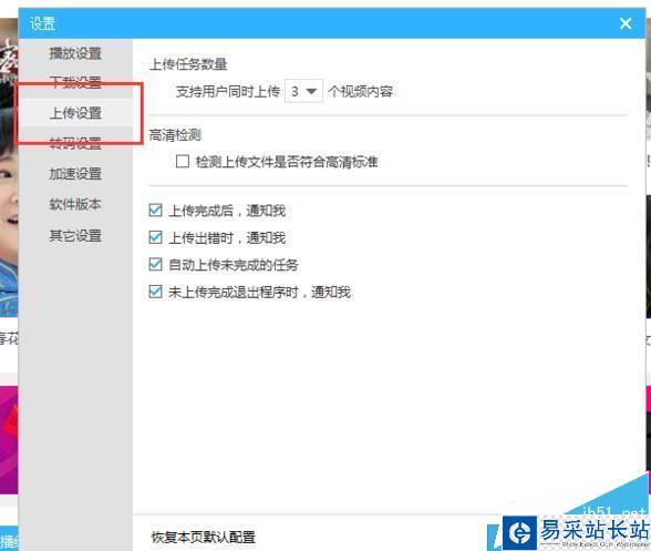 5、在設置對話框中,選擇左側窗格中的“上傳設置”選項卡。如圖所示;