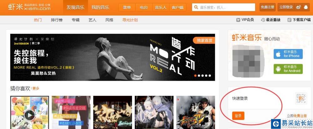 1、進入蝦米音樂的網頁版,在右側找到登錄的頁面,掃一掃或者是用戶名、密碼登錄都可以的,進入即可。