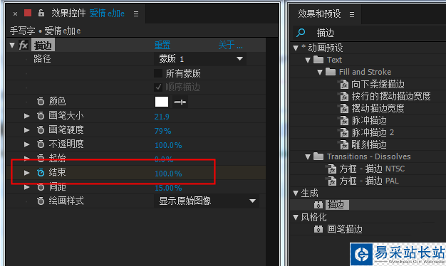5、在描邊結束處打上關鍵幀,并將開始值設置為零
