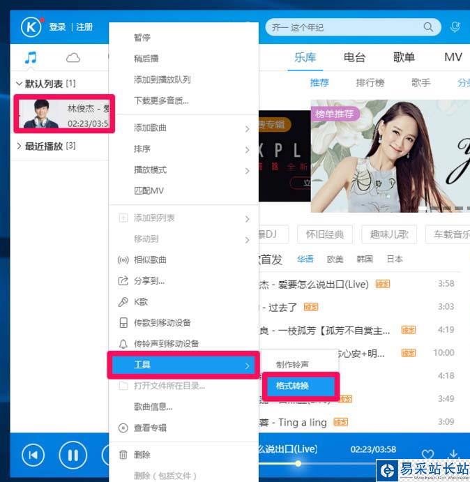 3、右鍵點擊默認列表中的歌曲,在右鍵菜單中點擊【工具】-【格式轉換】;