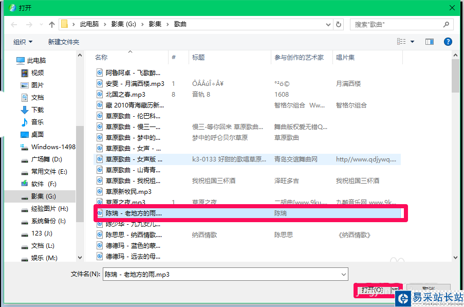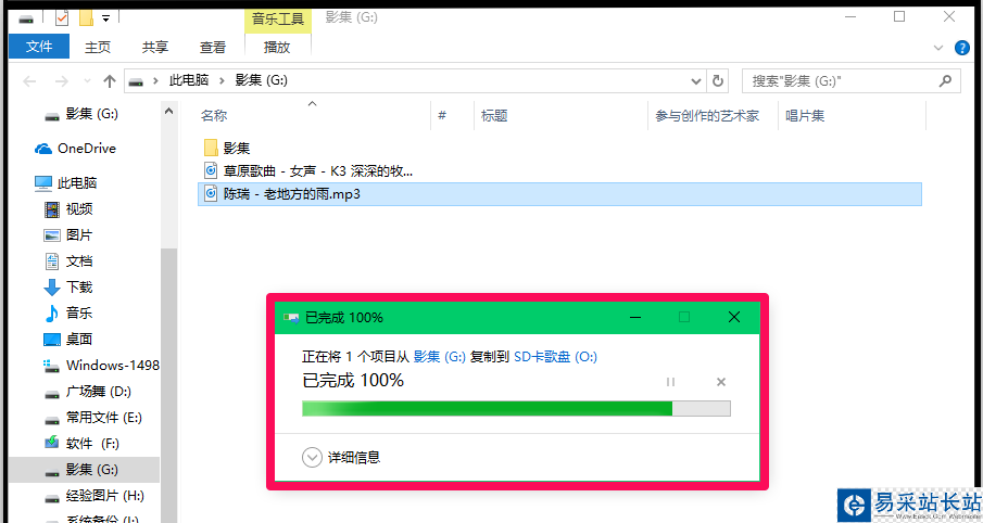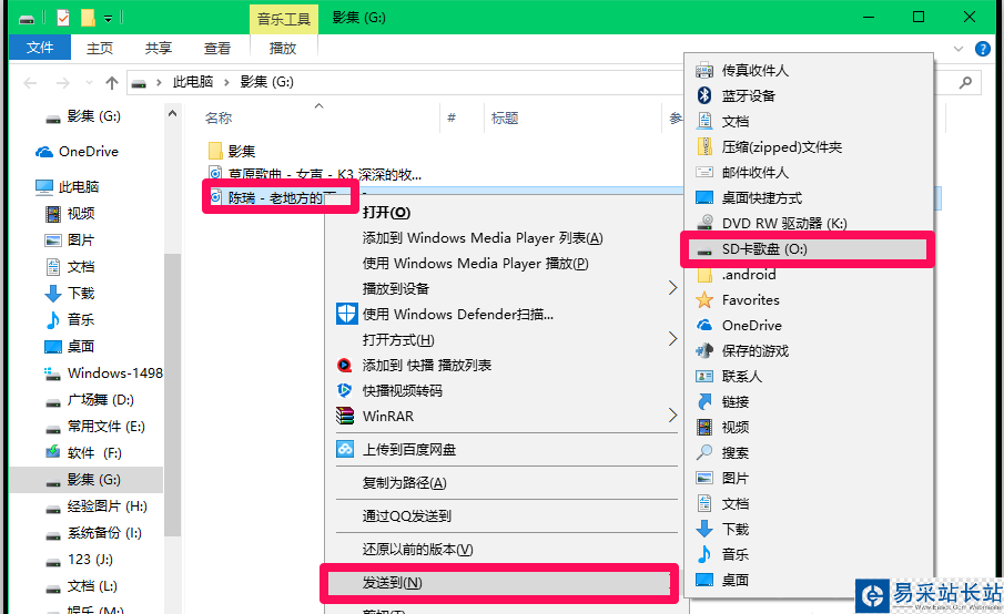 9、在電腦的本地磁盤G中,顯示了轉換的歌曲:老地方的雨.mp3,點擊便可以播放,把隨身聽的SD卡插入讀卡器再插入電腦,我們可以把轉換的歌曲發送到隨身聽的SD卡中。右鍵點擊歌曲《老地方的雨》,在右鍵菜單中點擊:發送到 - SD卡歌盤(O);