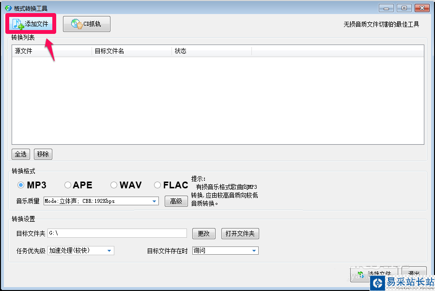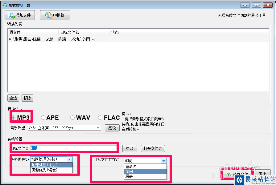 6、此時需要轉換的歌曲便顯示在格式轉換工具窗口的轉換列表中。點擊:轉換格式【MP3】,確定目標文件夾,【任務優先級】我們可以選擇:加速處理或資源優先,【目標文件存在時】可以選擇:重命名、詢問或覆蓋,最后點擊:轉換文件;