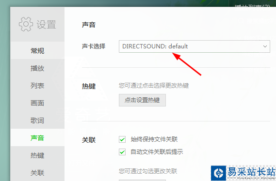 4、在設置的界面點擊聲音,可以看到聲卡選擇,這里的選擇默認的DIRECTSOUND;default,如圖所示