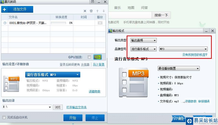 4、接下來,進(jìn)行轉(zhuǎn)換格式和其它的設(shè)置了。點(diǎn)擊“輸出設(shè)置/詳細(xì)參數(shù)”中的下拉菜單,進(jìn)行設(shè)置,選擇“輸出音頻”。